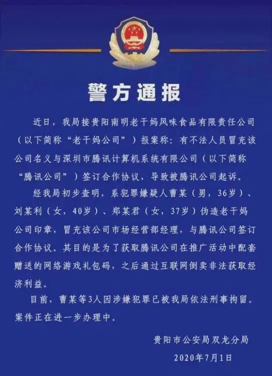 7月1日,随着贵阳警方发布了腾讯与老干妈千万广告费纠纷案是因为3人伪造印章与腾讯签合同,也让这件事情真相大白。但网上传闻“腾讯状告老干妈拖欠广告费提及某搜索引擎”,对此百度官方回应称“手里的瓜突然就不香了”。