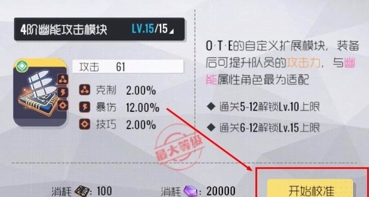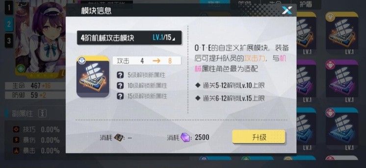 模块初始等级为1级,在强化等级不足之前只能提供少量的基础属性增幅,可以消耗资源来进行强化——注意,模块的强化需要通过关卡的通关来进行解锁。当强化等级分别达到5级、10级、15级时,模块将会获得副属性的增幅。