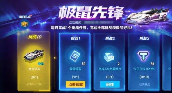 免费获得这款赛车的活动还没有开启,需要等到2月28日,届时会有新的活动挑战上线,玩家每天可以完成一个任务,等完成所有的挑战任务之后就能领取到永久的极鼠先锋。想要提前体验一下这款赛车的性能,可以在活动中心的页面进行分享,就可以提前三天感受极鼠先锋的操作和速度,在福利中心的活动界面上还有每日礼盒可以领。