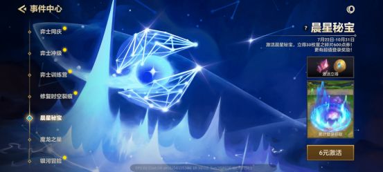 活动期间,在事件中心晨星秘宝的活动页面,可用6元激活晨星秘宝福袋,开启福袋立得30枚星之碎片和600点券,并解锁累计登录任务,完成累计登录任务,可领取额外奖励