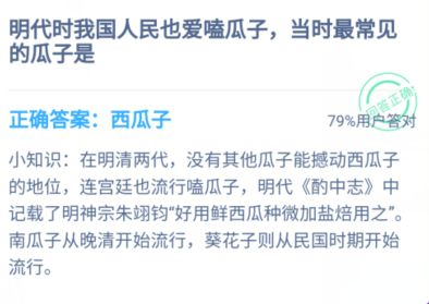 蚂蚁庄园明代时的瓜子是什么?1月11日问题中,明代时我国人民也爱嗑瓜子,那么在当时大家最常见的是什么瓜子?瓜子家家户户都能吃到,有的人还会自己做,喜欢吃瓜子的也能了解一下在明代大家都是吃的什么瓜子,下面会有本站小编给大家提供答案。