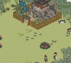 2、因此玩家在左边和下面牡丹花丛中,就能摘取到牡丹了,只需要六朵就可以了。然后就能看到牡丹亭了。