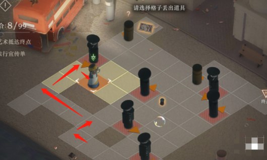 2、这个时候道具可以仍在自己身前一格的位置,这个位置不会遭到游客阻拦。