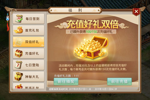 活动期间,道友充值30元及以上金额可获得双倍充值好礼次数:如原本充值30元获赠好礼1次,活动期间则可获赠2次;额外获赠次数上限为150次。