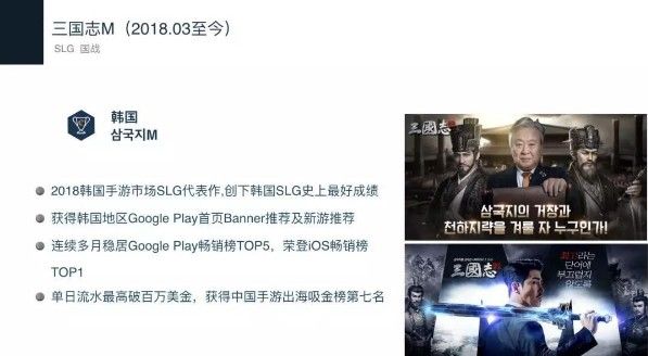 其中《三国志M》是去年3月由Efun于韩国发行的slg游戏,这款游戏是截至目前国内入韩SLG中成绩最好的产品。其曾经获得了古哥 play的banner推荐和新游推荐,连续多月进入古哥 play畅销榜的Top5之列,并获得过单日流水过百万美金的好成绩。