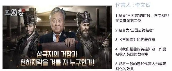 接下来就是将用户定位和营销手段结合。比如Efun过去做游戏推广时会选择明星、艺人、网红作为游戏代言人,而《三国志M》的代言人是一名韩国作家,名叫李文烈。其原因在于这名作家和《三国志M》的预定核心用户相关度较高,三国历史在韩国具有较高的知名度,而其接触三国历史的途径之一就是李文烈翻译的《三国志》,在韩国搜索引擎上键入“三国志”,“李文烈”排在了关联词的第二位。换句话说,喜欢看他的书的人,就是此前定位的30岁到40岁、有付费能力、喜欢三国题材的男性用户。