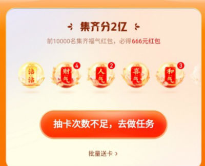 在集福气活动中,大家需要收集财气,人气,豪气,和气以及运气五张卡。如果收集5种祝福卡,则可以合成祝福牛卡和合成一个福气红包,综合用户可以在新年前夜的凌晨零点瓜分一亿。