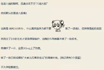 第一个BUG就是业原火事件,那时候的阴阳师还没有魂十一这个副本,魂十也没有如今的平均24秒那么快,那时候还停留在大多数玩家还用大天狗、姑获鸟刷魂十的时代。直到有一天有人在打业原火时发现了一个BUG:在进痴这个副本的时候,立即点下方的八歧大蛇,然后玩家就会进入御魂一层,立马怪的血量也都是常规御魂一层的血量,但奖励却是痴的奖励。玩家们只需要一只食发鬼或者茨木外带几个狗粮就可以9秒通关一次。