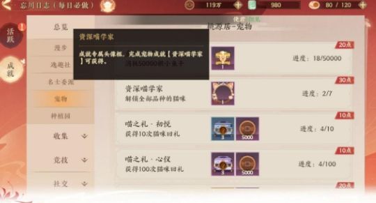 宠物数量、繁殖次数、玩具获得数量、小鱼干数量、猫咪回礼成就:铜币、猫玩具、名士经验书、铜币、信物宝匣。