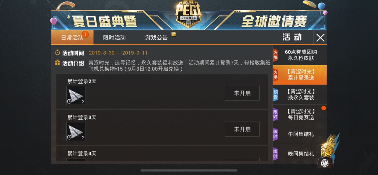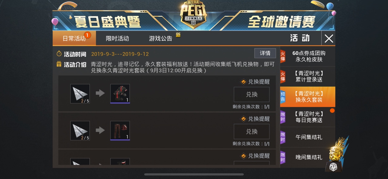 青涩时光,追寻记忆,永久套装福利放送!活动期间累计登录7天,轻松收集纸飞机兑换物*15(9月3日12:00开启兑换)。