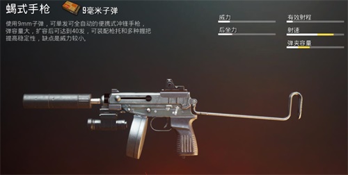 蝎式手枪使用9mm子弹,拥有单发、全自动两种模式,可装配握把、枪托的微冲锋手枪,将在全地图刷新出现。蝎式手枪的配件卡槽将有五个之多,在近战中的威力可以媲美主力武器。满配的蝎式手枪将拥有40发的弹夹容量和极佳的操控性,配合“冲锋手枪”默认的高射速,无疑将成为了近距离交火中的利器。“手枪”的枪械定位也使得蝎式手枪无法对于中远距离的目标构成有效威胁。毫无疑问,蝎式手枪的出现将极大改善游戏中手枪武器“鸡肋”的尴尬位置。