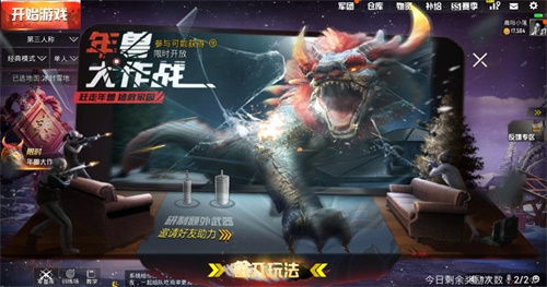 新春来临之际,《刺激战场》也将推出多项包含节日元素的限时游戏内容。玩家可以看到组队大厅的变化,充满了春节氛围。全新的玩法模式——“新春模式”也将限时供玩家体验。在经典匹配玩法中,玩家可以随机进入新春模式。在新春模式中,地图中会有年兽雕像刷新在地图上。玩家可以通过调查这些年兽雕像,吸引并击杀小年兽来获得掉落物资,其中击杀小年兽掉落的“信号枪”可以召唤“年兽守卫”。“年兽守卫”实力强悍,需要多位玩家齐心协力共同击杀。