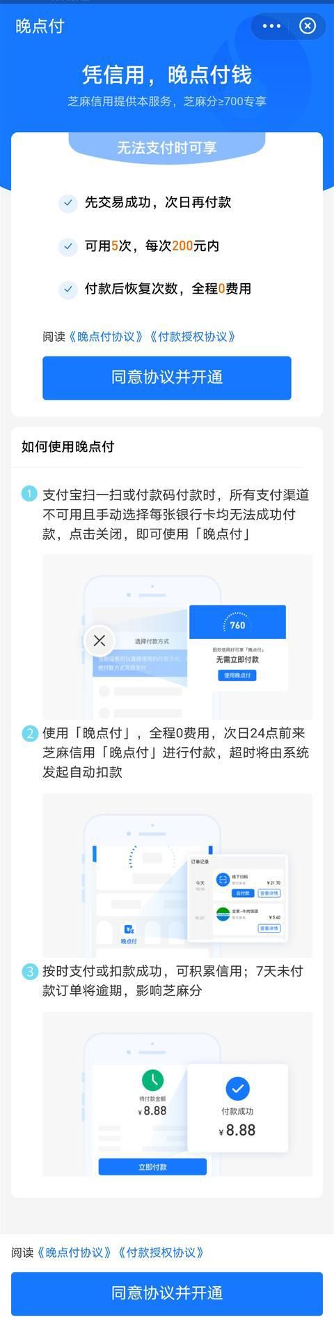 不知道芝麻信用分高于700的你有没有开通支付宝“晚点付”呢?觉得这个功能是不是多余的?