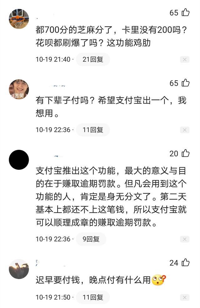 支付宝“晚点付”功能需要芝麻信用分700以上才可以开通,不过很多网友表达了对这一功能的看法,觉得这是支付宝挖的坑,并不是让利于用户。有网友甚至直言:我是差那一天时间,还是差那200元?