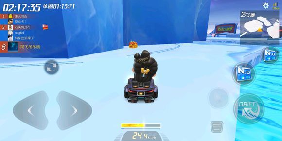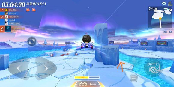 冰峰裂谷这张图的复杂性还是有点高的,如果是不熟悉图的玩家可能正常跑都会吃亏,何况还要找宝箱,有不少玩家可能跑了三圈都没看到宝箱的位置甚至最后比赛都没能顺利完成,还得重新再开一局然后慢慢找。而实际上这个宝箱的位置就在如上图所示的第一个冰岛跳台之上,只不过是在一侧的冰壁的后方难以看见。