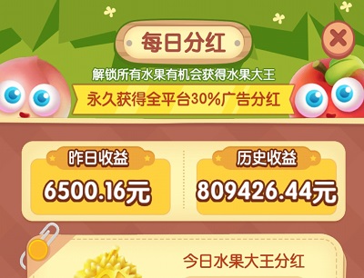 解锁所有水果就有机会获得水果大王,永久获得全平台30%广告分红。解锁到第50个地块随机产出水果大王,随机地块有几率直接种植出水果大王,集齐五福召唤果100%召唤出水果大王。每天中午12点平台自动核算昨天全平台广告收益和水果大王数量,将30%收益均分给拥有水果大王的用户。目前一个水果大王一天可以获得325元广告分红收益。