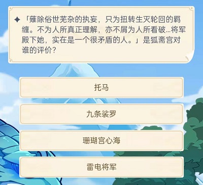 18.[薙除俗世芜杂的执妄,只为扭转生灭轮回的羁缠。不为人所真正理解,亦不屑为人所看破……将军殿下她,实在是一个很矛盾的人。]是狐斋宫对谁的评价?(D)