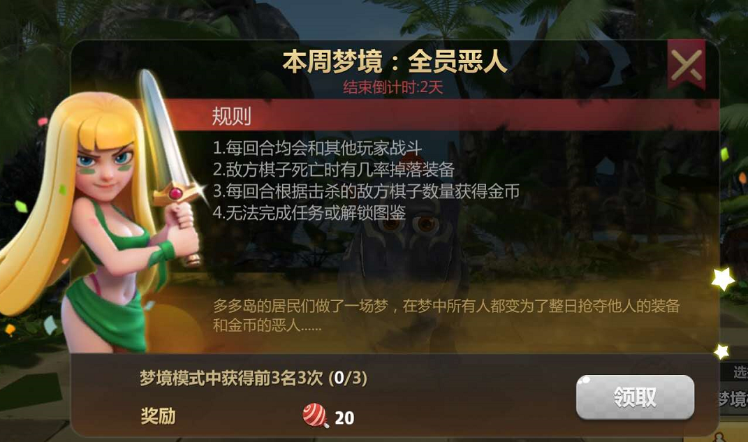 本次更新的另外一个看点是梦境模式的加入,这是一个节奏非常快,非常适合欢乐局的玩法合集。新模式中装备获取速度与棋子刷新频率将会变得更快,适合血气方刚的玩家们,速战速决刚正面。能让玩家在更短时间内,更快节奏体验自走棋乐趣的模式。《多多自走棋》官方为了新用户更快上手和老用户玩出新感觉,也是拼了。