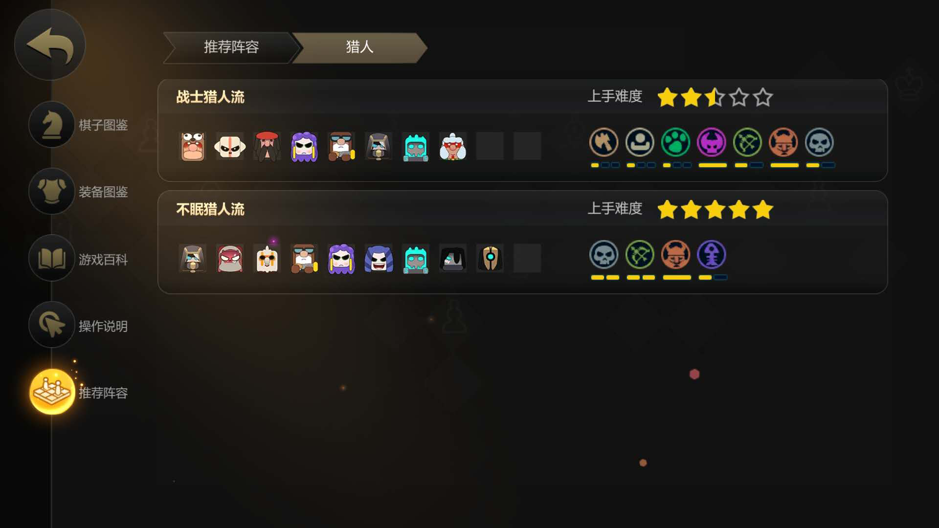阵容搭配问题,是自走棋的一大核心,此次更新之后,玩家通过游戏大厅右上角即可进入【图鉴】-【推荐阵容】点击感兴趣的阵容,可以看到具体阵容情况,包括主要棋子、对应效果、阵容优势等等,一键解决所有问题!