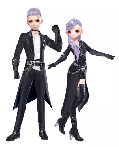 女生紫色的长发透露出自由随性,黑色的风衣下是一双过膝长靴,在展现姣好身材的同时保留了一份神秘,更显魅惑风情。男生梳着精神利落的大背头,纯黑外套上点缀着银链皮饰,看起来独具潮流风格。