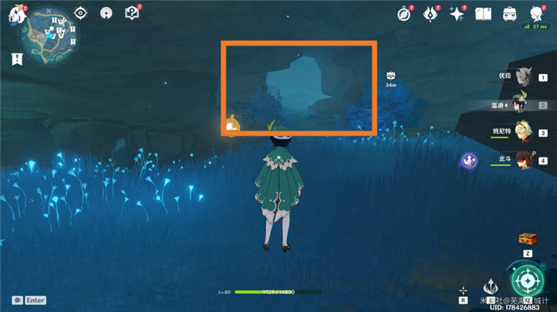 将【雷传送门】方向对准上图的左下方,进入传送状态之后,玩家会被传送到一处【雷属性碎石堆】附近,用元素反应击破碎石堆,我们可以得到第一块继电石和唯一的雷种子点。
