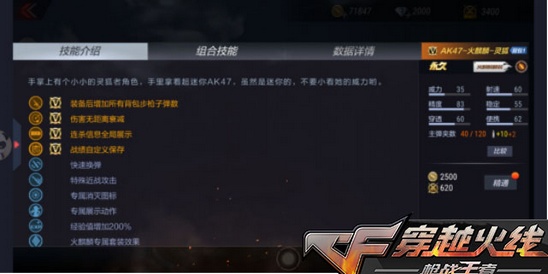 基础性能没有任何问题,全部都是顶尖水平。那AK47-火麒麟的专属技能,火麒麟-灵狐有没有阉割呢?话不多说,直接上图,大家可以很清楚的看到,火麒麟-灵狐的技能没有任何阉割,与AK47-火麒麟完全一致!
