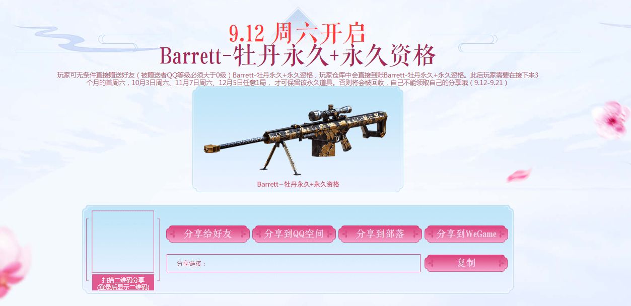 注意,这个活动是让玩家能够无条件的送出Barrett-牡丹以及永久资格的,但是规则上也表示自己不能接受自己的赠送。