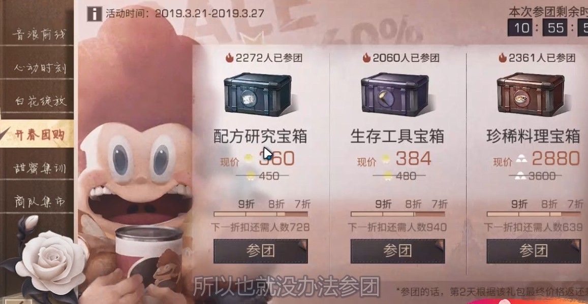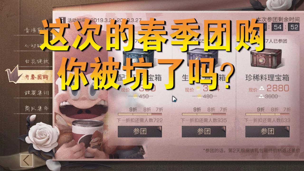 接下来让我们说说,这个开春团购,总感觉这次有点坑人的意味,以前是先参团然后再买,而这次直接变成了先买再参团,还好我没有小太阳,所以也就没办法参团,我在想是不是很多人,都没看清条件,然后被坑了呢,这个最后是不一定能达到,最低折扣7折的,这些参团宝箱,我感觉有的还可以,有的是比较坑的,配方研究宝箱,可以获得200个配方残页、150个数据、3000金条,总的来说,对于需要配方残页,抽奖的小伙伴来说,还是比较划算的,毕竟50元人名币才200个配方残页,打7折只需要30多块钱。