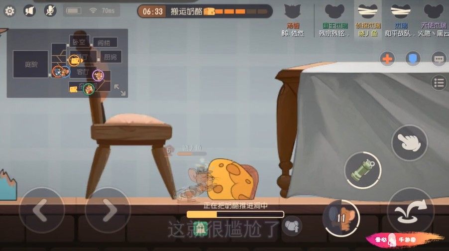 进洞走餐厅,因为把猫勾引在卧室,直接奶酪运到厨房,毕竟两扇门3人推的话,等猫过来应该就能推进去了,没想到猫还主动开门,这是准备一窝端嘛,赶紧撤,毕竟还有个奶酪就庭院,队友被捉不管,开黑的也不管,毕竟是上分,先推奶酪,而且天使还在旁边,就算放飞,也是有技能复活的,天使也被捉了,被打了下,不救了推奶酪去,这夹子也是很有灵性啊,差一丢丢。