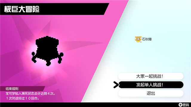 极巨大冒险不能使用自己培养的宝可梦,而是系统分配的四种宝可梦中选择其中之一,其他成员也会依次进行选择。你可以单独行动也可以跟其他玩家组队。