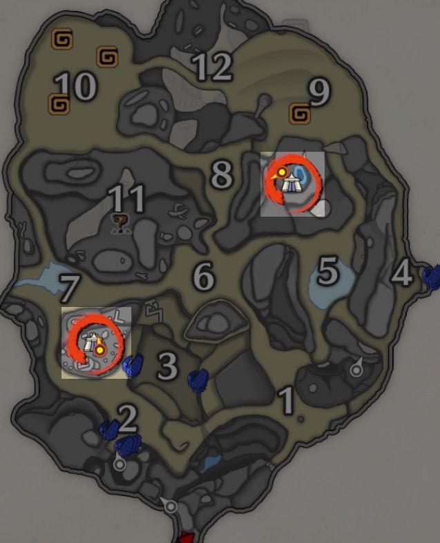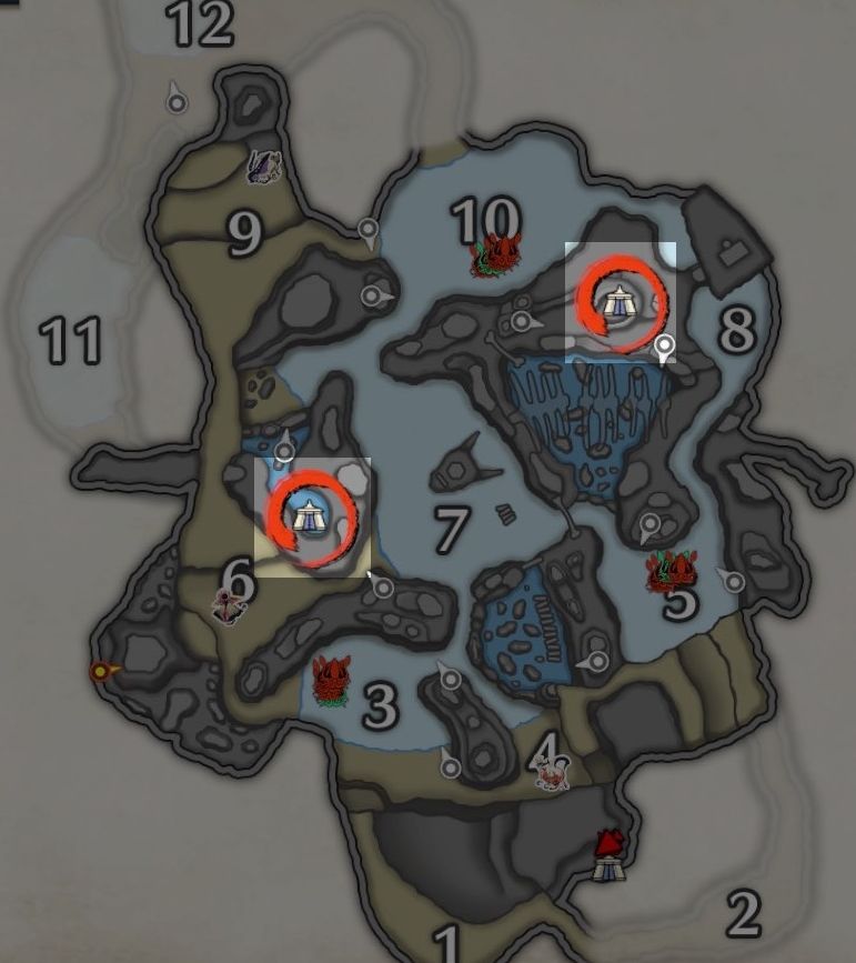 有两个营地,一个在2区和7区中间的山上,一个在5区、8区和9区中间的洞里,就是小地图的那个水池边。