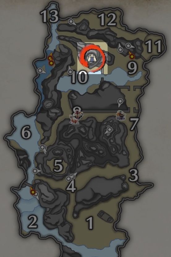 只有一个营地,试玩版的时候大家都基本知道位置了,在10区右上角的山上。