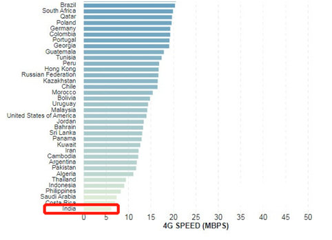 身在电信行业和手机行业高度发达的中国,人们可能根本不能接受无法接入互联网只能用2G网络的世界,但这就是印度90%的人所面对的世界。虽然印度也有4G服务,但因为电信行业基建太差,资费太过便宜,网络使用人数太多,造成了印度网络拥堵网速下降,4G网络速度硬生生只比2G快那么一点点,连3G都达不到。