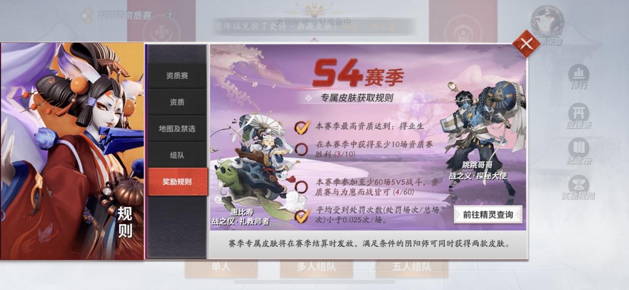 作为S4赛季的专属皮肤奖励,【惠比寿:战之仪·礼教师者】和【跳跳哥哥:战之义·探秘大使】将为所有参与战斗的大人们加油助威!大人们只要积极参与对战,并在赛季中最高达到得业生及以上,且资质赛中获取过10个胜利场次,即可在S5赛季时自动获取跳跳哥哥赛季专属皮肤【战之义?探秘大使】奖励! 而大人们若在S4赛季中参加至少60场包括资质赛或为崽而战的5V5战斗,且平均受到处罚次数小于0.025次/场,就可以获得惠比寿赛季专属皮肤【战之仪?礼教师者】奖励。