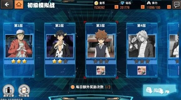 关卡奖励中,除了每一关卡通关之后会有固定星级的辅助卡奖励之外,还会附带掉落有其他星级&效果的辅助卡哟,不仅如此,初级和中级的训练课程、金币等其他道具也会在通关后获得哒!需要注意的是,固定星级的辅助卡只会在首次通关此层时掉落,如果重复闯关,只会获得随机星级&效果的辅助卡以及训练课程哦!为了让玩家获得更多合适好用的辅助卡,在初级模拟战中官方还设定了每日额外奖励,每天会有三次通关后获得额外的随机辅助卡奖励。