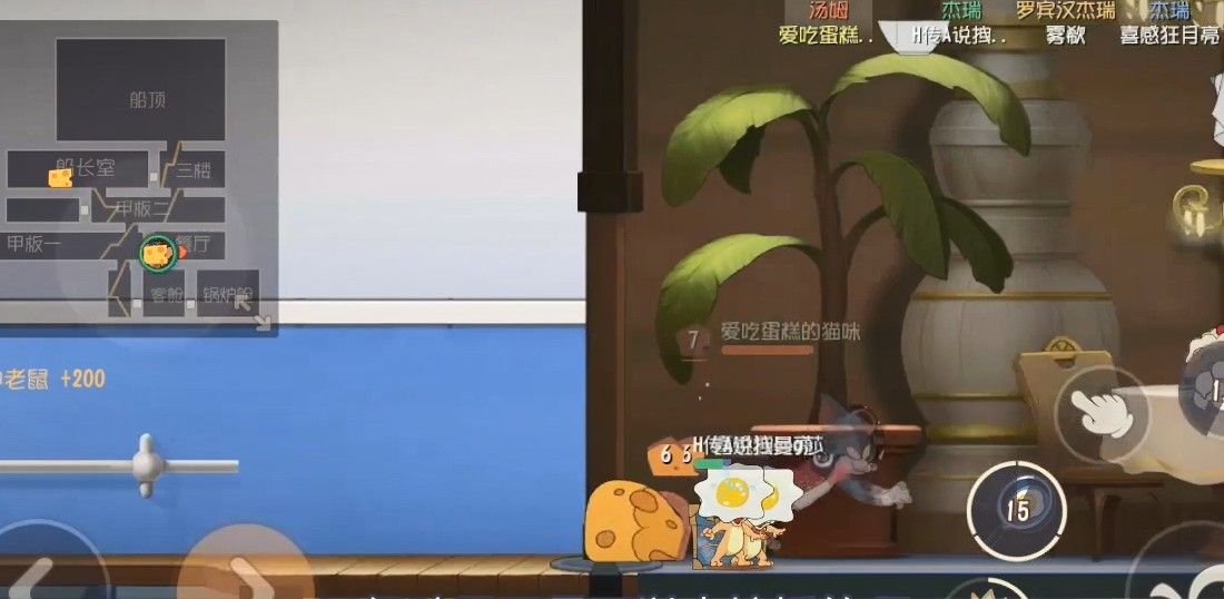 在这一局中,我发现老鼠玩家,存在着一个普遍的缺点,那就是如果队友被绑火箭,而自己是残血,就不知道干什么呢,迷迷糊糊的,不知道去找道具,也不知道回血,坐等队友飞天,这可能就是很多老鼠的通病吧,所以导致鼠玩家被坑多了,就改玩猫了,这种队友真的不配赢。
