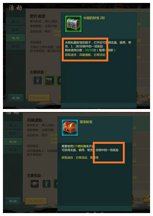 3、装备镶嵌:用到的材料是纹钢,参加风陵渡船、武林联赛和野外首领等活动,可以获得宝箱开出随机纹钢。