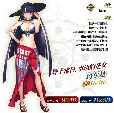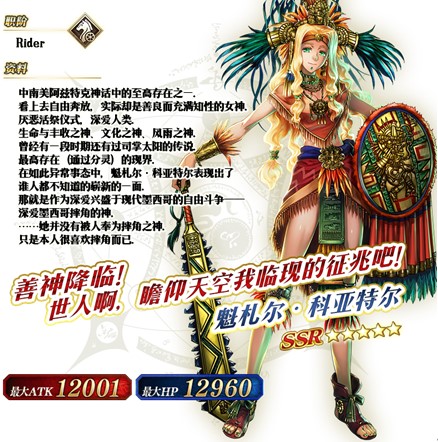 同时参与推荐召唤的还有「★5(SSR)魁札尔・科亚特尔(Rider)」、「★4(SR)玛尔达(Rider)」、「★4(SR)玛尔达(Ruler)」3骑从者,其中「★4(SR)玛尔达(Ruler)」为限定从者,在此次推荐召唤结束后不会加入剧情卡池。