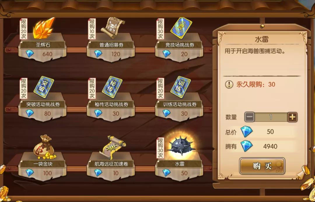 船长们每日有两次免费参与围捕的机会,免费次数将在每日零点重置。意犹未尽的船长也可以在蓝钻商店购买道具【水雷】来补充围捕次数,有自信的船长可不要错过这笔划算的买卖啊!