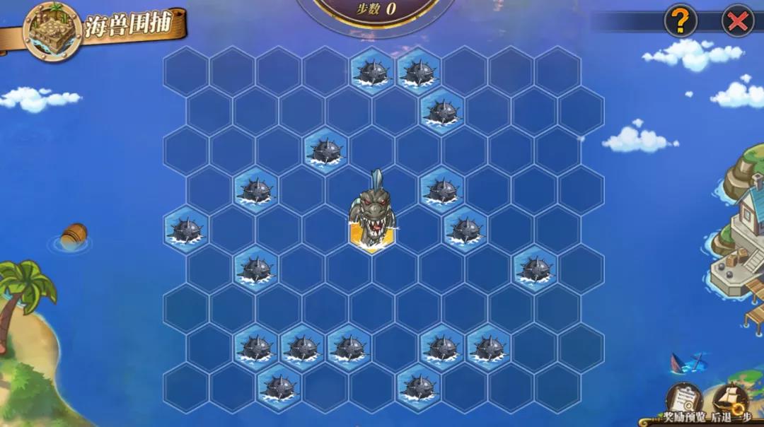 围捕开始后,海域上将会随机出现一些水雷来帮助船长完成围捕,因此善用水雷的位置可以大大提升海兽围捕的成功率!值得注意的有,每步只可以部署一颗水雷,而海兽则有机会随机移动一格至两格。一旦海兽移动到了地图的边缘,即视作成功逃脱、围捕失败。所以每一步都要尽量考虑周全,不要给它留下可乘之机呀!
