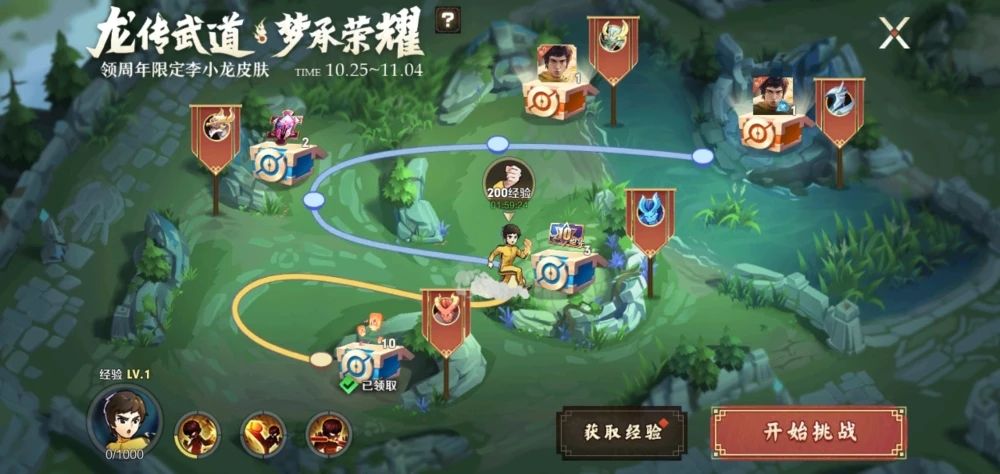 活动设置5个关卡,成功挑战关卡野怪,可获得对应关卡的奖励(第4关奖励为裴擒虎-李小龙皮肤,第5关奖励为李小龙粤语语音包)。