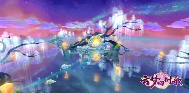 快看,人界苍劲的树木摇身一变!银色藤蔓上挂着一个个黄色小灯笼,妖娆神秘;水面石台透出绿色光芒,后方的神鹿似乎在守护着什么……此乃天机!天机!