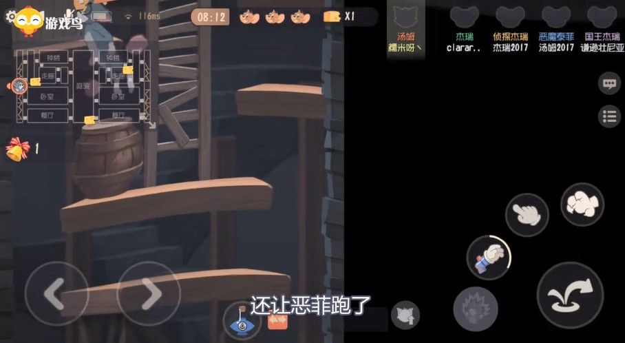 绑上火箭后老鼠很快就来救人了,这个香水瓶扔的有点难受啊,直接砸倒脚下了,然后恶菲也被救了,在客厅里发现隐身药水和苍蝇拍,现在算是有一个老鼠到手了,我来庭院蹲点,蹲到了国王运气不错,就数这个批溜我时间最长了,绑上庭院火箭后感觉不太好,周围是一个道具也没有,果然老鼠过来立马救下了国王,但是国王好像挂机了,发现国王挂机后就没来救了。