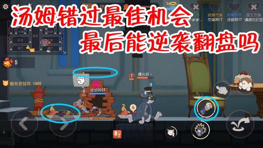 墙洞出来后我马上来守墙洞,后面还跟着个杰瑞,回头一发手型枪先带走你,先绑上火箭,正好旁边还有老鼠夹,火箭时间不多了老鼠应该是不会过来救援了,我拿着锤子直接过来修墙洞,这个高尔夫球是真恶心呐,我打算扔远点的,居然没扔掉,最后墙洞还是被打开,但是我的手型枪立功了,盲拉抓到了恶菲,而侦探已经进洞了,差一点啊这把就输了。