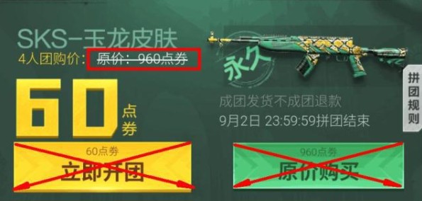 如图所示,4名玩家拼团,每名玩家只需要付出60点卷,就可以获得SKS-玉龙皮肤。在这里需要提醒一下,在拼团的时候有一个雷区需要规避。