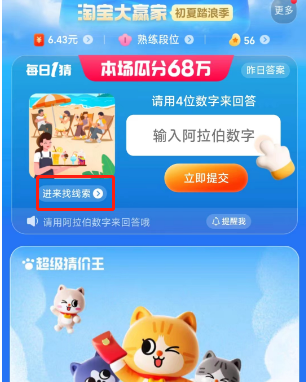 淘宝7.6每日一猜请用4位数字来回答答案是什么?7月6日的这个问题很多玩家都在讨论,用4位数字就可以完成答题,具体的答案解析本站小编已经分享在下方,大家可以看看小编是如何找到正确答案的,详细的请多看看攻略吧。