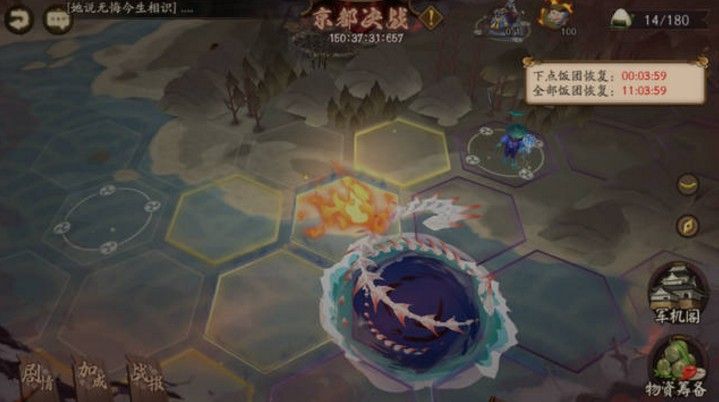 接下来说说饭团,右上角的饭团就是我们的行动点,每隔4分钟恢复1行动点。行动点可以进行式神委派,也可以用来挑战敌军。想要拿到更高奖励的玩家我建议你不要去做委派,将委派任务留给那些没时间肝的玩家就可以了。式神委派一次只能委派10个式神,每个参与委派的式神都不可以低于四星,委派一次需要使用150饭团,没时间肝的玩家注意一下饭团恢复时间就可以了。挑战奖励会比委派奖励要高,式神练度低一些不要紧,打出最大伤害即可。清小怪的时候建议带上清姬、书翁、追月和两个AOE输出式神,打Boss当然是离吞吞会更好。