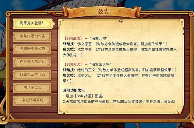 从公告来看,战国应该是集控制与输出并存的SSR,而且拥有奥以延展技,变身大佛后可能着重于强化自身生存能力,而当战国登场后,在游戏前期颇为火热但后期却显得乏力的海军队似乎又燃起了生机,海军队是由海军三大将青雉,黄猿,赤犬,卡普,组成的海军队伍由于他们之间相互的海军增益以及大将BUFF带来优秀的属性提升,使得他们同时登场时具有较强的属性,而战国登场后,也许会将这种海军BUFF传承下去,而海军队乏力的原因,也是因为队伍的输出核心较少,所有伤害的担子都落在了黄猿身上,但是黄猿自身的面板较脆,很容易在对方频繁的AOE下被带走,战国既弥补了队伍输出的乏力,也能带来更强的控制效果,群体击飞,这也太秀了,也许在战国正式上线后,海军队又可以站在主流阵容里,而战国能否带领海军队重现昔日荣光,就让时间去验证吧!