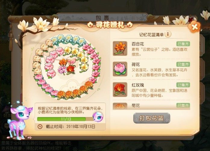 随着祖国70周年华诞的临近,三界各地生灵也纷纷献上自己的礼物。从9月26日~10月13日,玩家可以在长寿村邂逅来到大唐献礼的灵兽小鹿,行走三界帮助它寻找合适的花朵完成献礼。只要参与迷阵寻宝、群仙来贺、剑胆琴心等活动,玩家就能积累花朵。而作为回报,小鹿也将化身坐骑,与帮助它成功达到目标的玩家一同行走三界。