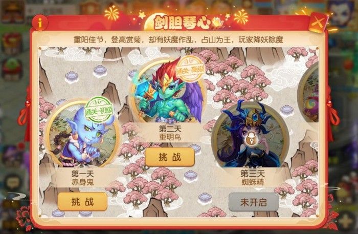 重阳节,正是登高远眺的好时机。为了能让三界众生享受假期,玩家也将向占山为王的妖魔发起挑战。在10月8日~10月14日期间,玩家可以组队前往参与剑胆琴心活动,挑战各路妖魔,保卫三界平安。